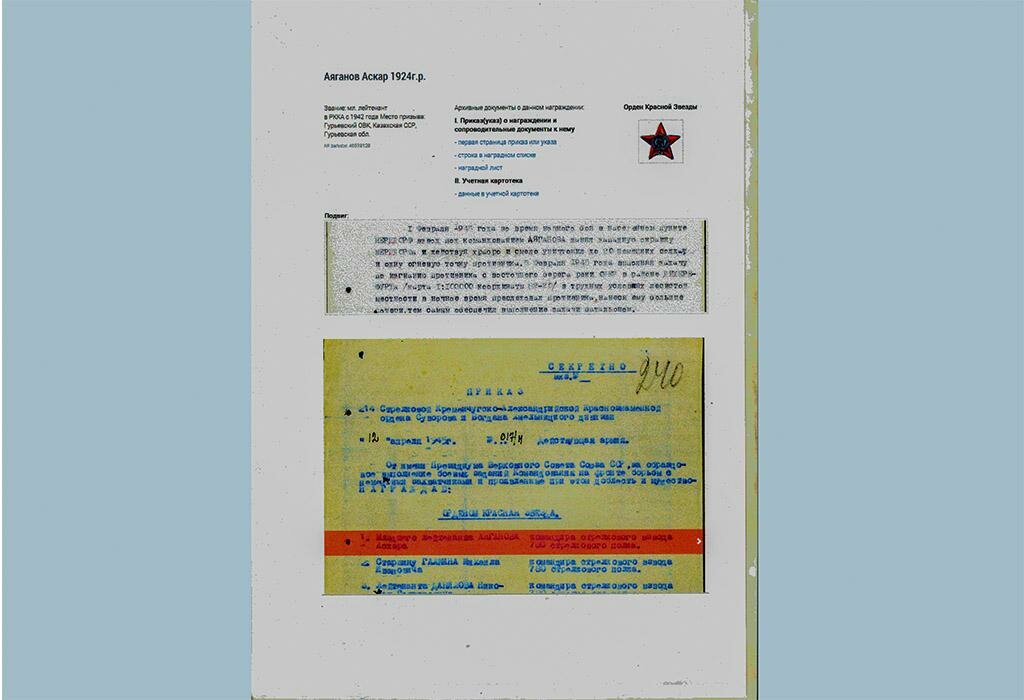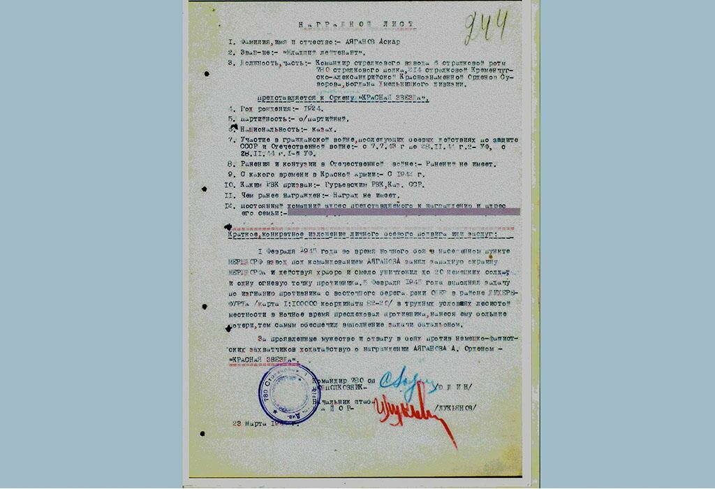 КСРО Қорғаныс министрлігінің сақталған құжаттарынан мынадай сөздерді оқыдық: «1 февраля 1945 года во время ночного боя в населенном пункте Мерцдорф взвод под командованием АЯГАНОВА занял западную окраину Мерцдорфа и действую храбро и смело уничтожил до двадцати немецких солдат и одну огневую точку противника. 5 февраля 1945 года выполняя задачу по изгнанию противника с восточного берега реки ОДЕР в районе ЛИХЕРЕФУРТА в трудных условиях лесистой местности в ночное время преследовал противника, нанеся ему большие потери, тем самым обеспечил выполнение задачи батальоном». Одан соң 780-атқыштар полкінің командирі подполковник Юдин былай деп жазады: «За проявленные мужество и отвагу в боях против немецко-фашистских захватчиков ходатайствую о награждении АЯГАНОВА А. орденом «Красная Звезда».