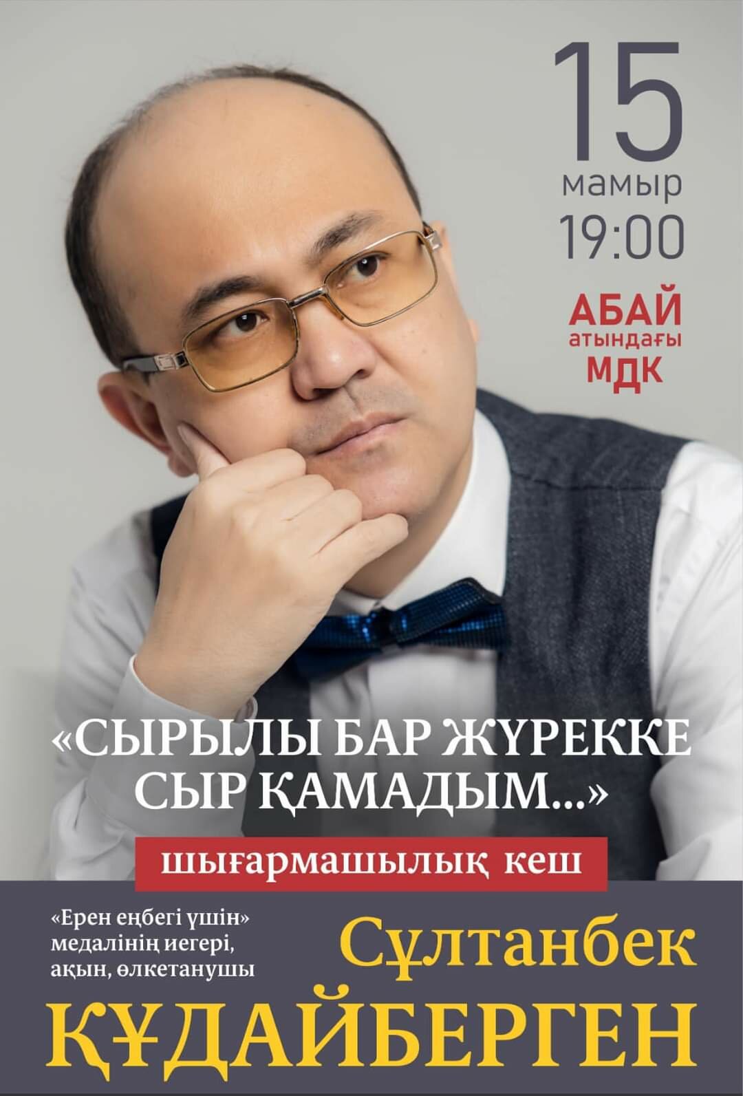 Шығармашылық кеш 15 мамыр күні сағат 19:00-де Абай атындағы мәдени демалыс кешенінде өтеді.