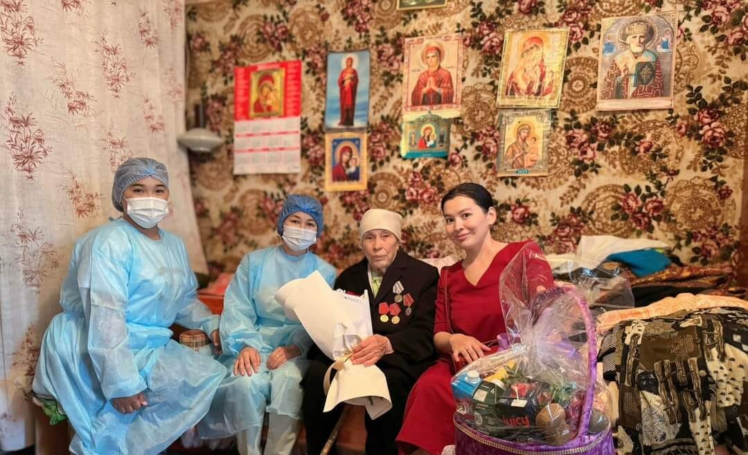Қазыналы қартқа жылы лебіздерін жеткізген ақ халатты абзал жандар бейбіт өмірге қосқан үлестері үшін алғысын жеткізді. Риза болған тыл ардагері медицина мамандарына, мерекемен құттықтап келген жандарға батасын беріп, рахметін айтты.