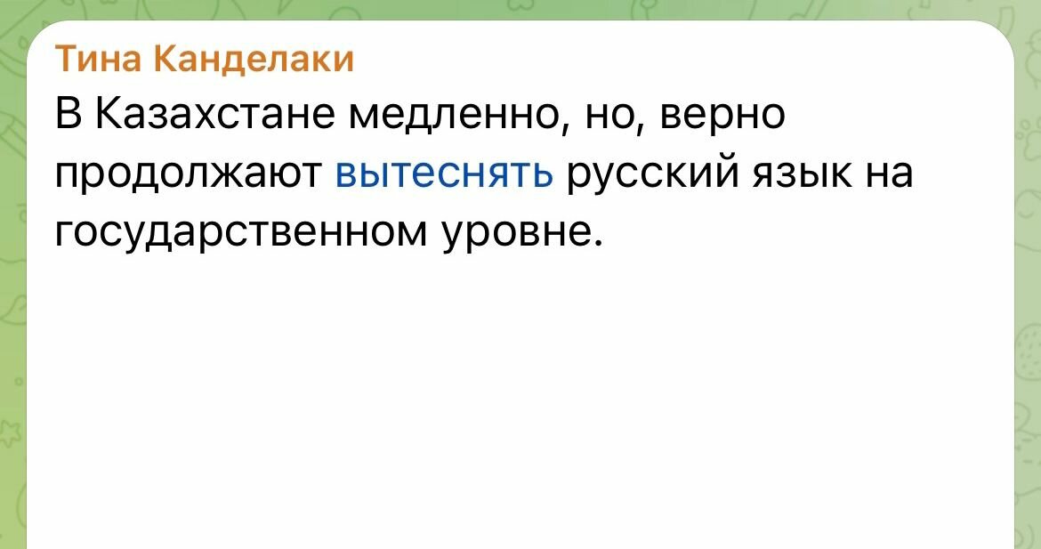 Ресейлік журналист Тина Канделаки өзінің Telegram-парақшасында Қазақстанда орыс тілінің қолданылу аясы тым шектеліп жатқанын жазған. Ол «Уральск» атауының – «Орал», «Узень» атауының – «Жаңаөзен» деп өзгеруі күмән тудыратын шешім екенін алға тартты, деп хабарлайды mangystaumedia.kz сайты El.kz ақпарат агенттігіне сілтеме жасап.
