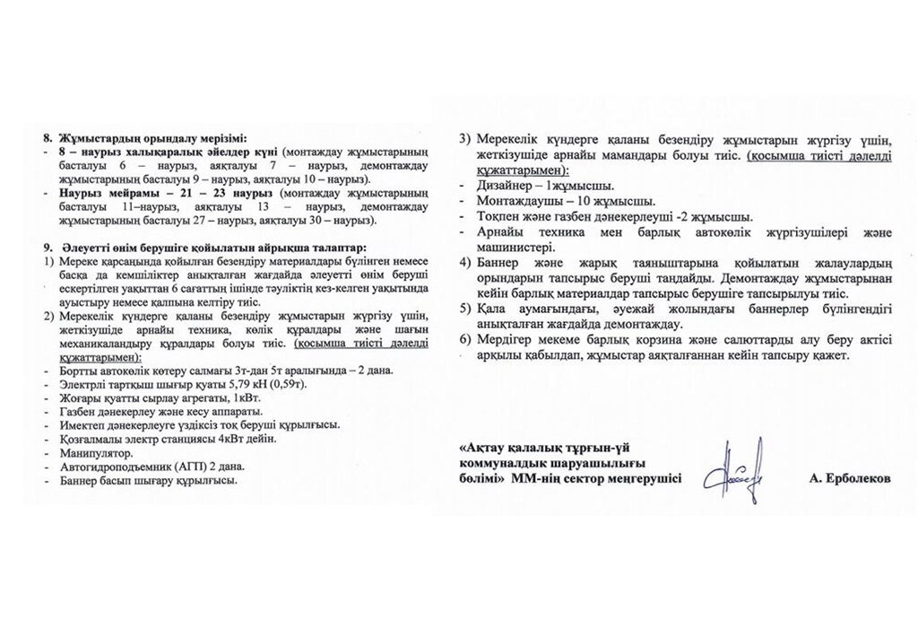 Хош. Биылғы безендірудің техникалық ерекшелігіне шолу жасайық. Мердігер мекеменің жауапкершілігіне билбордтарды баннерлермен безендіру, кермелі баннерлерді дайындау және орнату, мерекелік күндерге тутұғырларға мемлекеттік туларды ілу, «Салют» кәрзеңкесін безендіру, 18 тутұғырлы және 12 тутұғырлы кәрзеңкені безендіру сынды жұмысты жүктеген. Одан бөлек әлеуетті өнім берушіге арналған талаптарды да таныстыруды ұмытпаған.
