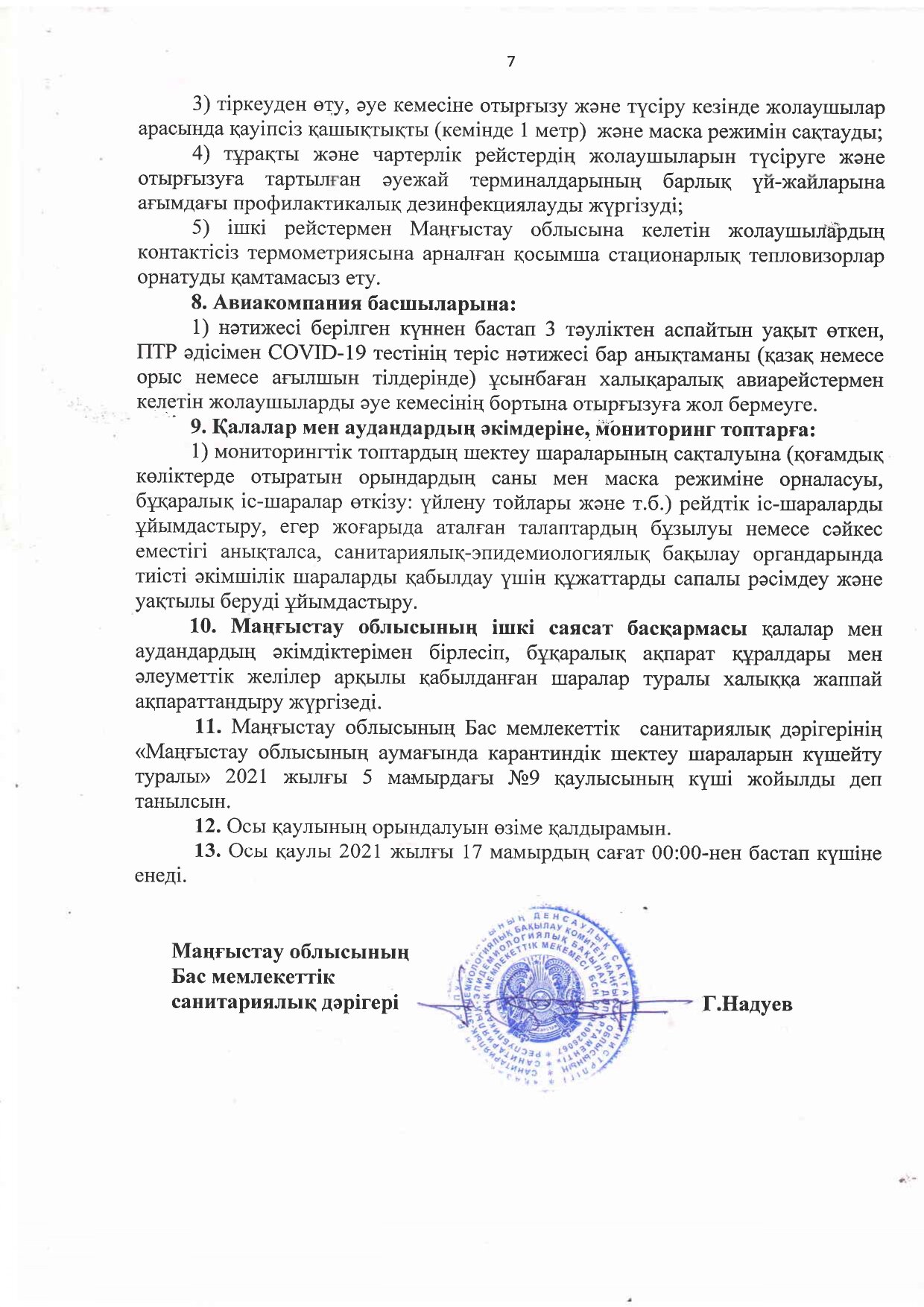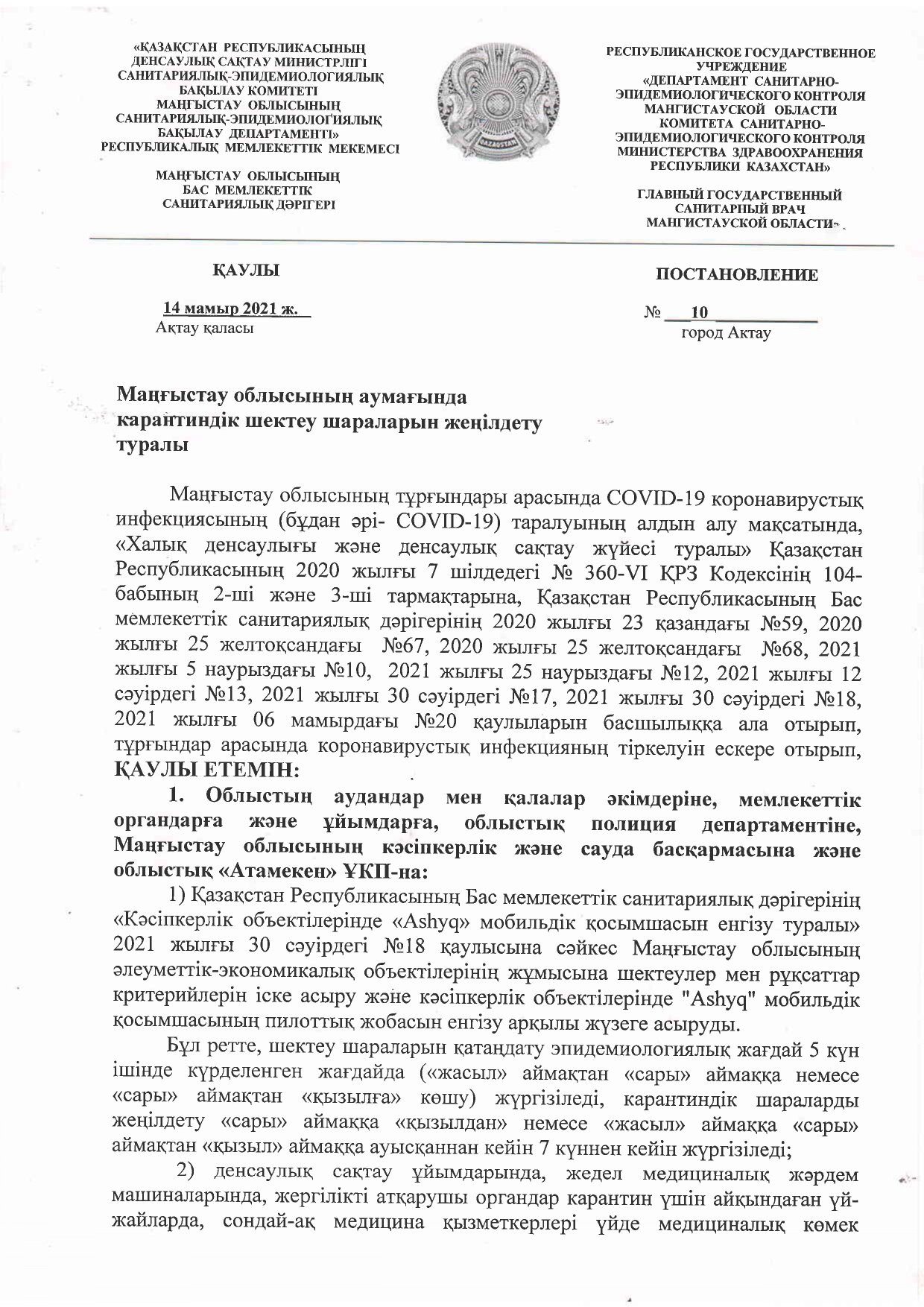 Маңғыстау облысының аумағында карантиндік шектеу шараларын жеңілдету туралы Маңғыстау облысының бас мемлекеттік санитариялық дәрігері Ғазиз Надуевтің жаңа қаулысы шықты. Қаулы 2021 жылғы 17 мамырдың сағат 00:00-нен бастап күшіне енеді.
