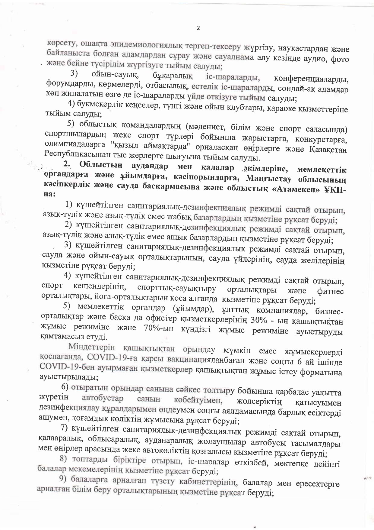 2) күшейтілген санитариялық-дезинфекциялық режимді сақтай отырып, сауда және ойын-сауық орталықтарының, сауда үйлерінің, сауда желілерінің, спорт кешендерінің, спорттық-сауықтыру орталықтары және фитнес орталықтары, монша, йога-орталықтарын қоса алғанда қызметіне;