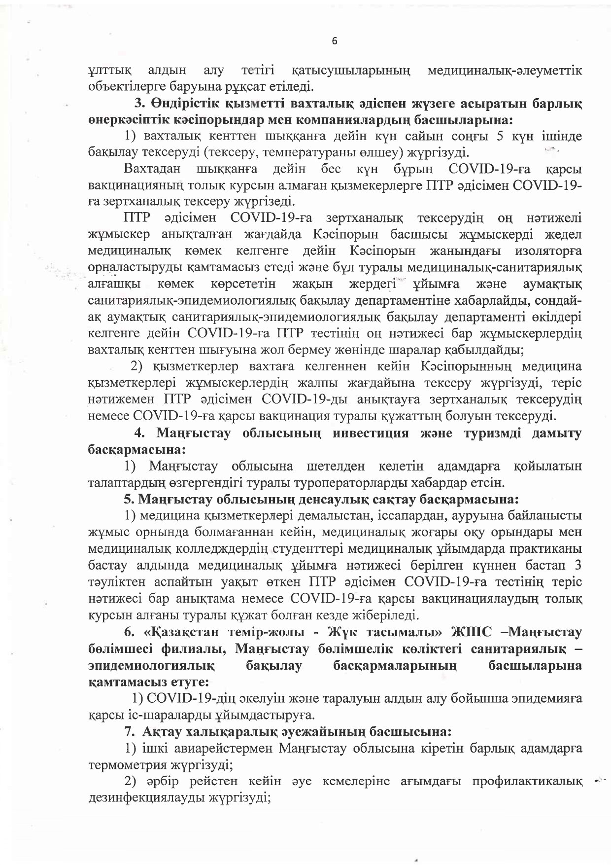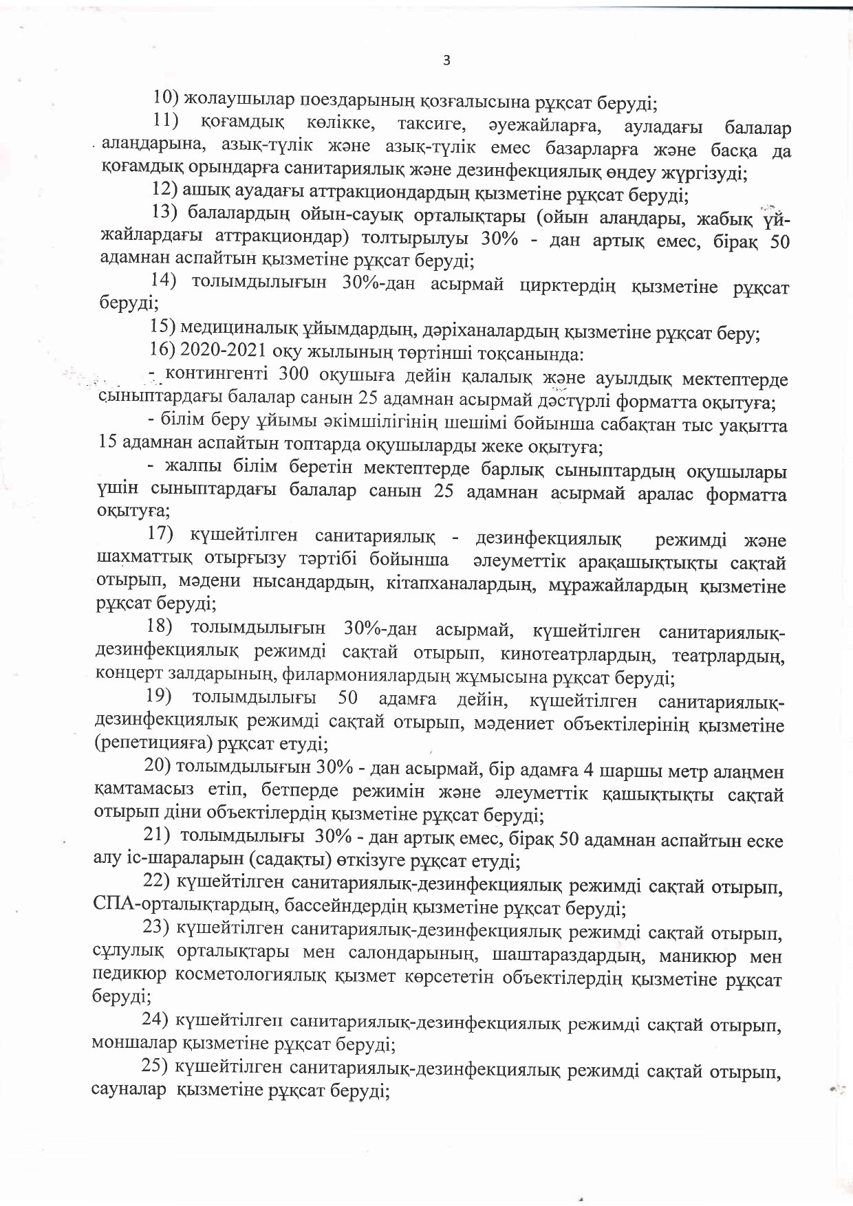 3) мемлекеттік органдар (ұйымдар), ұлттық компаниялар, бизнес-орталықтар және басқа да офистер қызметкерлерінің 30% - ын қашықтықтан жұмыс режиміне және 70%-ын күндізгі жұмыс режиміне ауыстыруға;