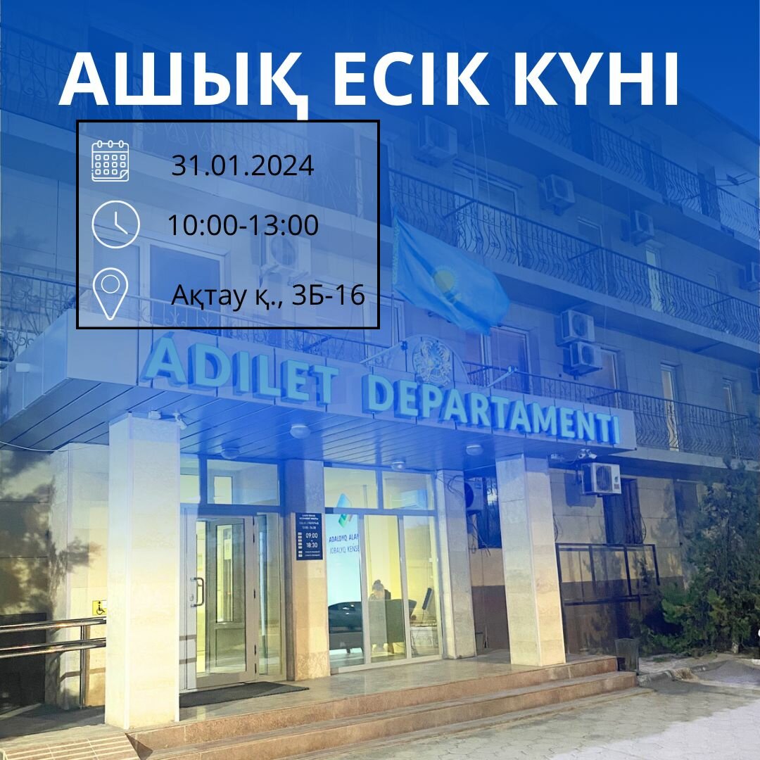 31 қаңтарда Маңғыстау облысы әділет департаментінде (3Б-16) жекеше нотариустар, адвокаттар және сот орындаушылардың қатысуымен «Ашық есіктер күні» акциясы өтеді, деп хабарлайды mangystaumedia.kz.