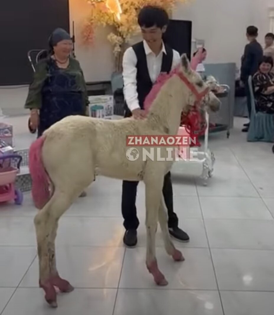 Тойда құлынның ноқта, жал, құйрығын, тұяқтарын қызғылт түске бояп тойға әкелген. Сондай-ақ екі құлағының ортасына қызғылт мүйіз орнатқан.