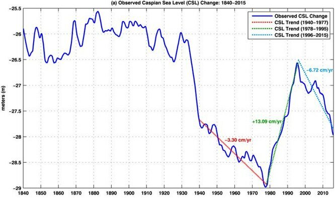 Последнее критичное падение Каспия на 4-5 метров ниже современных отметок произошло более тысячи лет назад. Тогда исчез Северный Каспий, и племена, которые жили на противоположных берегах «ходили» по бывшему дну Каспийского моря. Этот факт запечатлен на европейских картах XIV века.