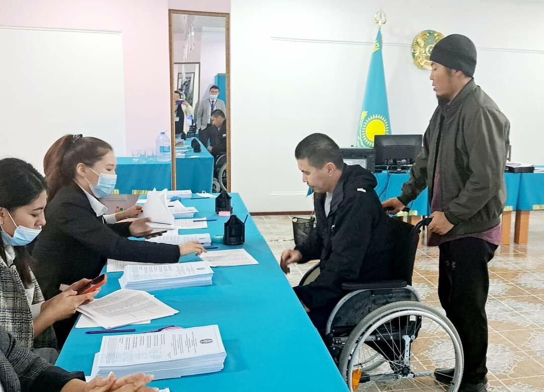 Айдынбек Муратов, проживающий в селе Курык Каракиянского района, пришел на 145 избирательный участок. Мужчина передвигается на инвалидной коляске.